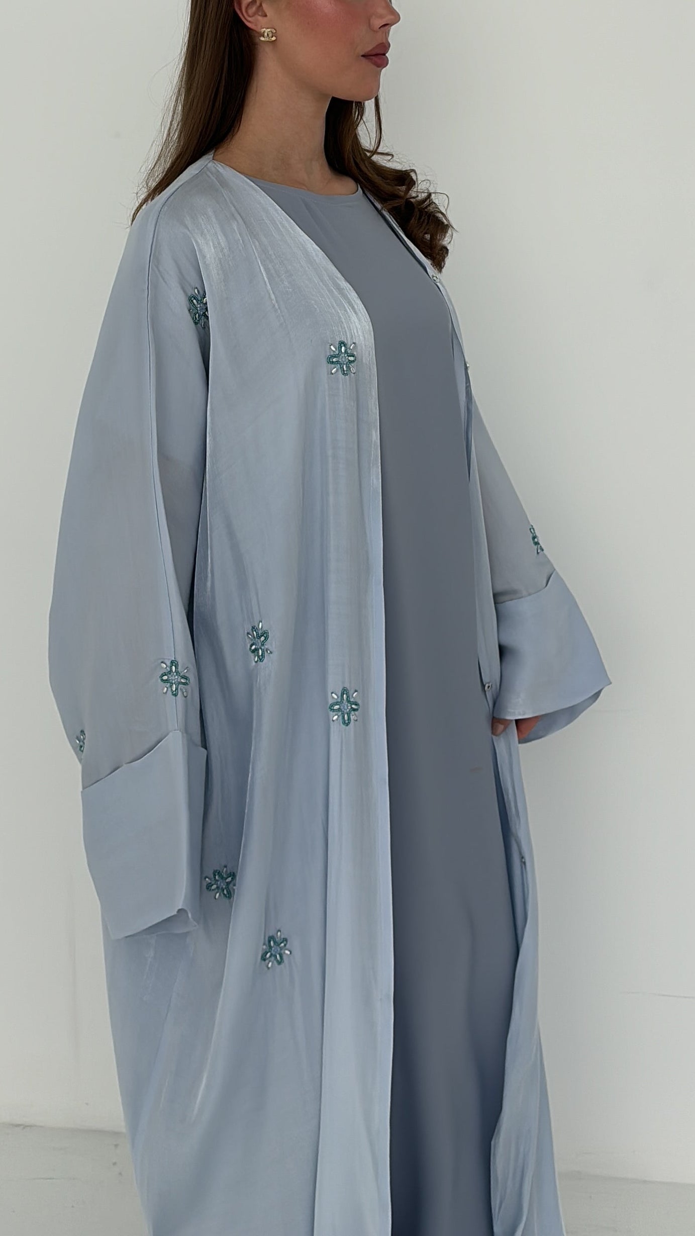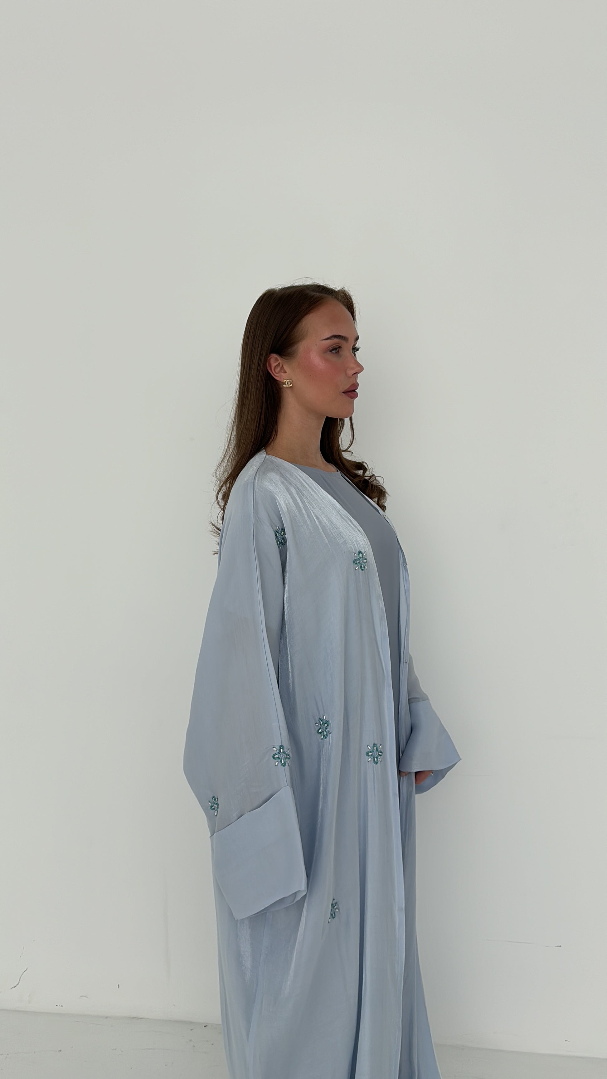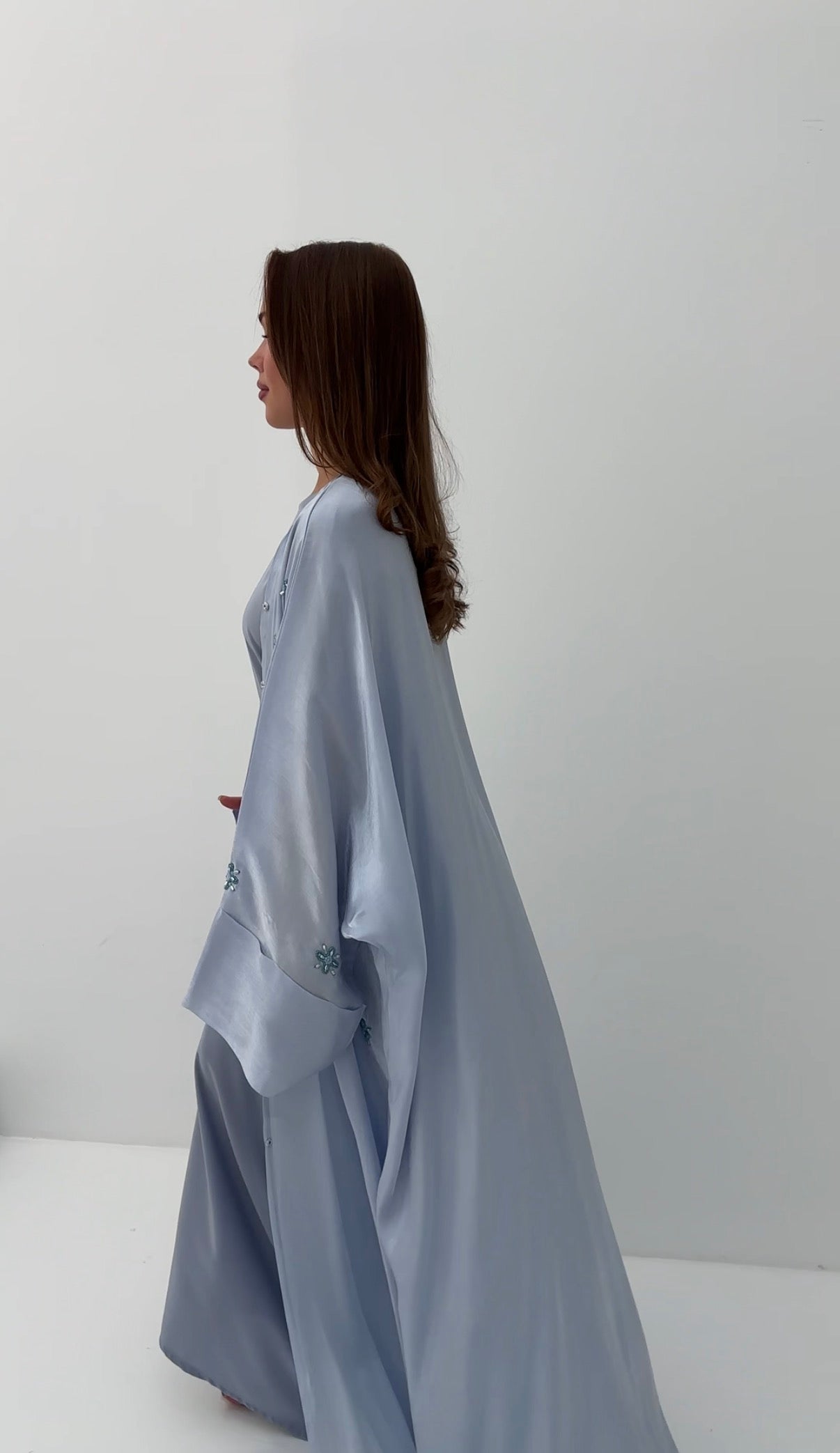 Our Pastel Abaya set includes our abaya, inner dress & matching scarf. Designed with wide sleeves & delicate hand sewn embellishments.