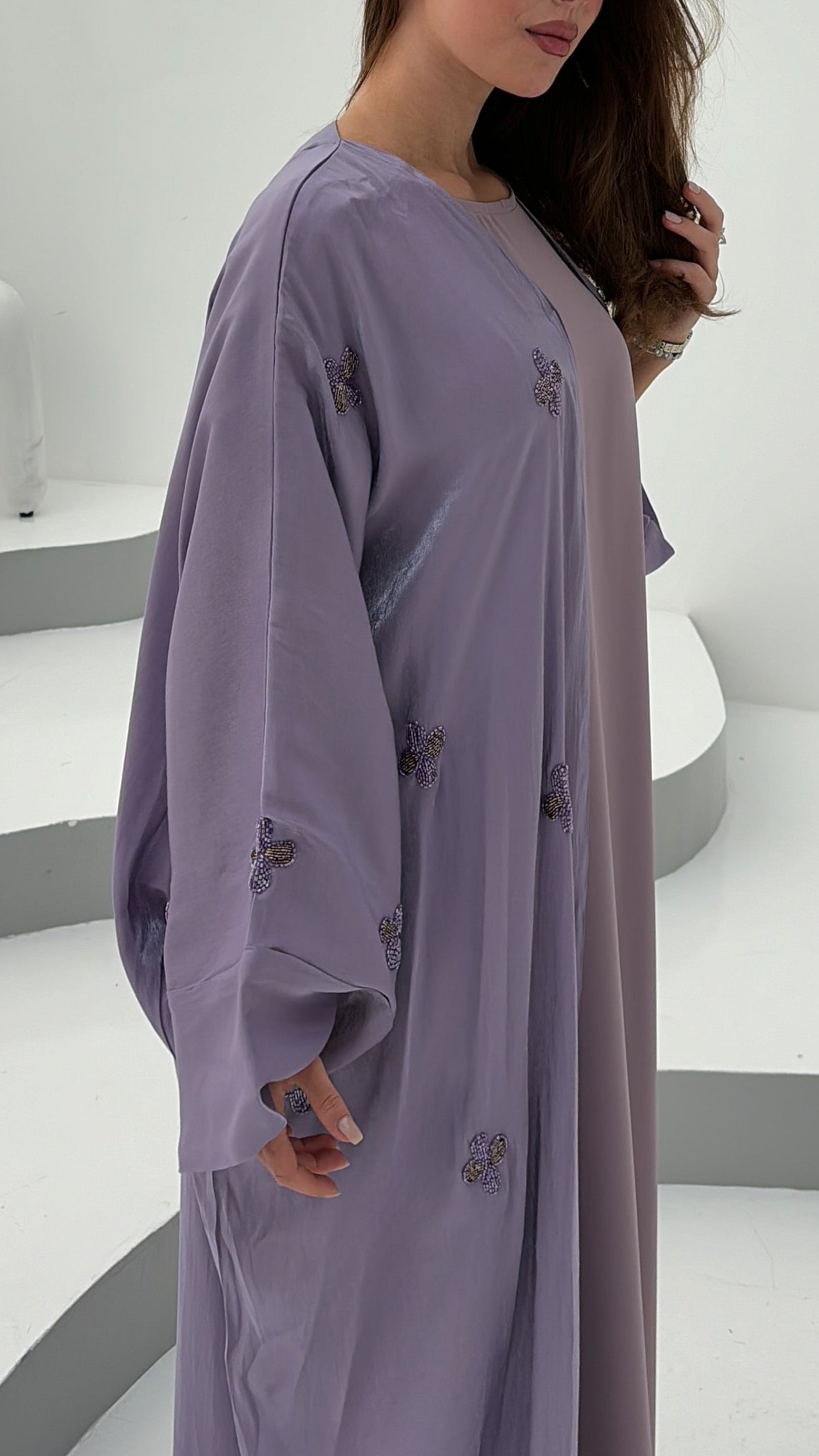 Our Pastel Abaya set includes our abaya, inner dress & matching scarf. Designed with wide sleeves & delicate hand sewn embellishments.